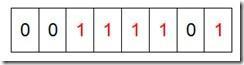 然后遍历这5个元素,首先第一个元素是4,那么就把4对应的位置为1(可以这样操作 p+(i/8)|(0x01<<(i%8)) 当然了这里的操作涉及到Big-ending和Little-ending的情况,这里默认为Big-ending),因为是从零开始的,所以要把第五位置为一(如下图):